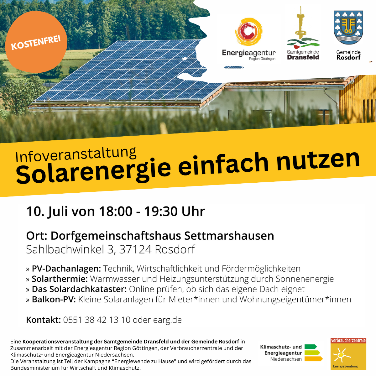 Die Samtgemeinde Dransfeld und die Gemeinde Rosdorf laden in Kooperation mit der Energieagentur Region Göttingen, der Verbraucherzentrale und der Klimaschutz- und Energieagentur Niedersachen zur kostenfreien Infoveranstaltung „Solarenergie einfach nutzen“ ein. Die Veranstaltung findet am 10. Juli 2025, von 18:00 bis 19:30 Uhr im Dorfgemeinschaftshaus Settmarshausen, in der Gemeinde Rosdorf, statt.
