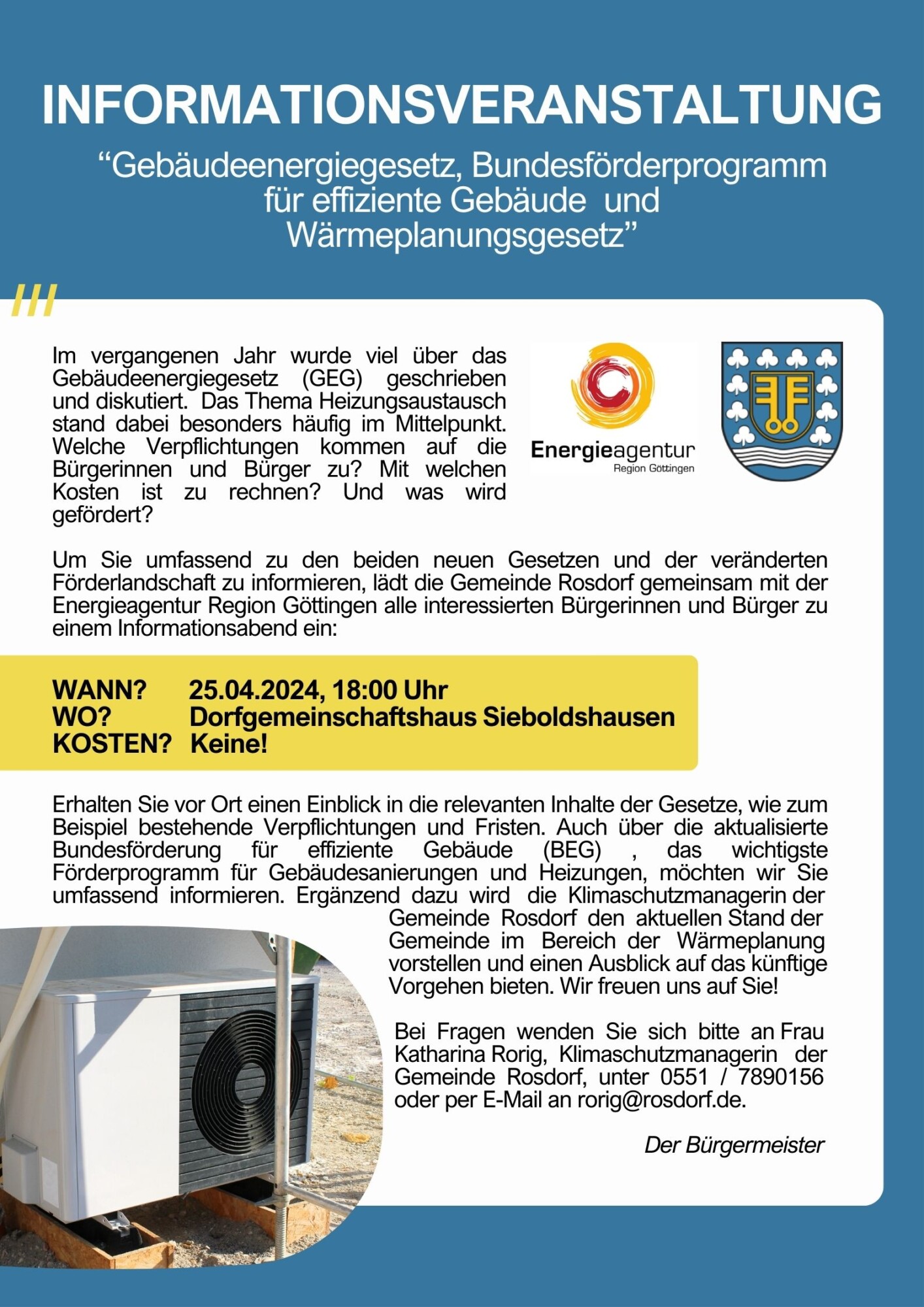 Um Sie umfassend zu den beiden neuen Gesetzen und der veränderten Förderlandschaft zu informieren, lädt die Gemeinde Rosdorf gemeinsam mit der Energieagentur Region Göttingen alle interessierten Bürgerinnen und Bürger zu einem Informationsabend ein: