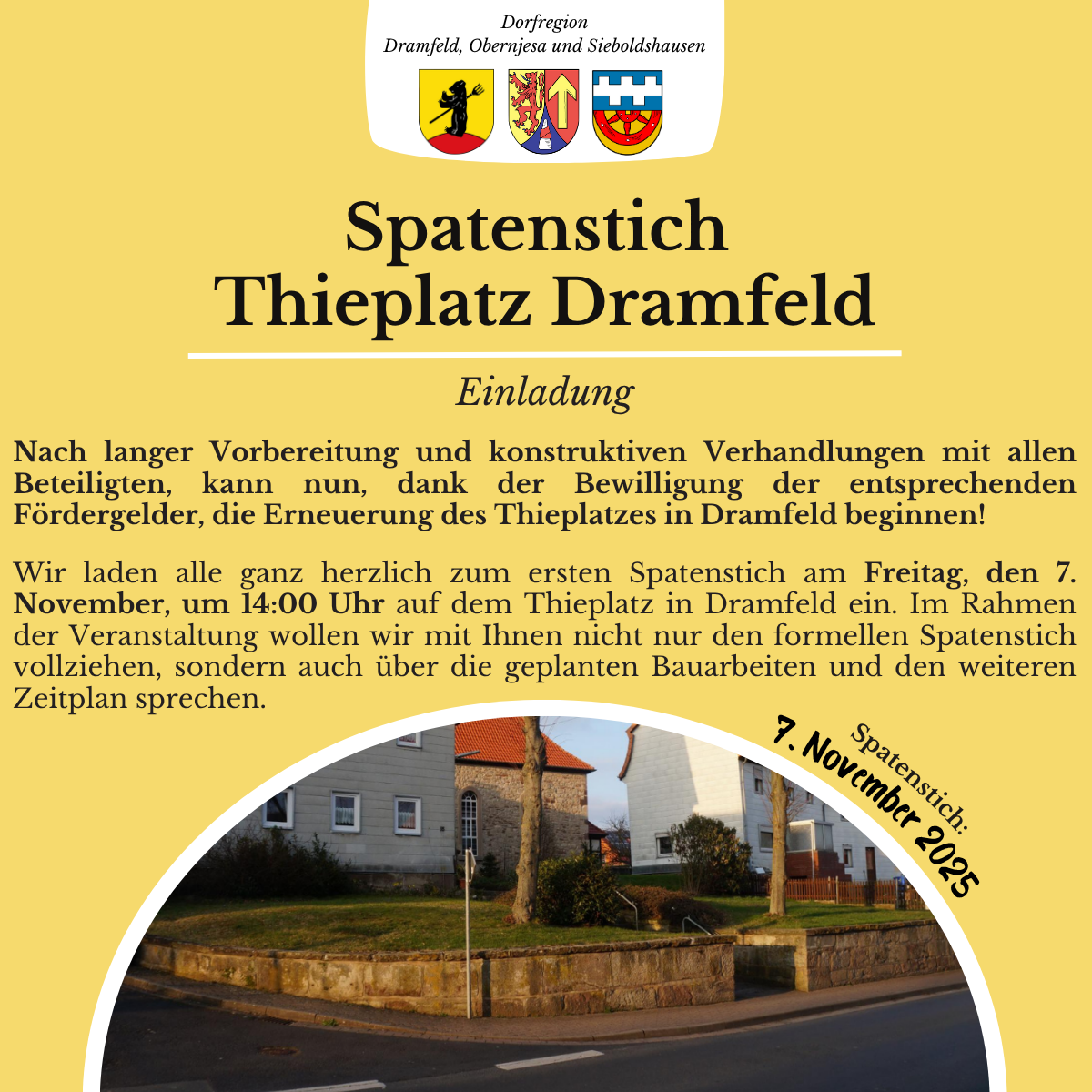 Spatenstich Thieplatz Dramfeld – Es geht los! In Ereignis, Versammlung Abgeschlossenes Event Start 7. November 2025 14:00 Ende 8. November 2025