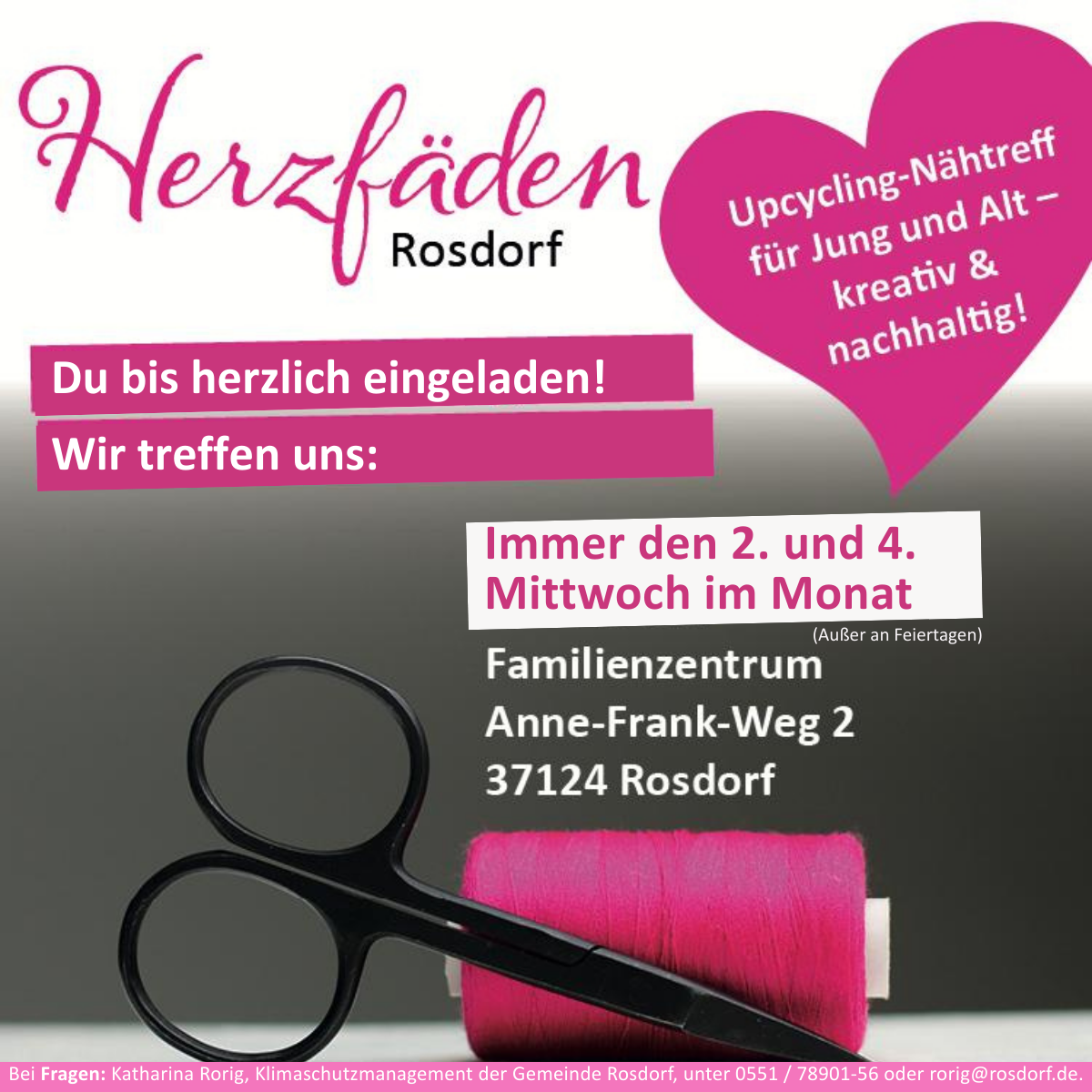 Immer am zweiten und vierten Mittwoch im Monat im Familienzentrum Rosdorf. Eingeladen sind Menschen aller Altersgruppen – vom Teenager bis zur Seniorin, vom neugierigen Einsteiger bis zur erfahrenen Schneiderin.